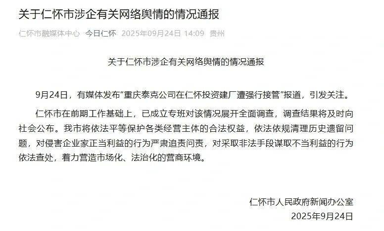 在仁怀市人民政府新闻办公室发布《关于仁怀市涉企有关网络舆情的情况通报》前, 双方在 司法程序之外 就项目处置的沟通未取得进展。重庆泰克方面表示, 企业愿意通过协商谈判解决问题,包括政府提前回购项目等方案 , 但多次联系仁怀市相关部门负责人,均未获得明确回应,协调会未召开。 同时,重庆泰克提出“ 政府拖欠保底处理量(9000吨/日)费用及滞纳金合计8亿元 ”的主张, 仁怀市相关部门要求其提供详细计算依据, 双方未达成共识。 2025年9月24日,针对“重庆泰克公司在仁怀投资建厂遭强行接管”的相关报道,仁怀市人民政府新闻办公室发布《关于仁怀市涉企有关网络舆情的情况通报》。 次日,遵义市委政法委牵头对该事件进行提级调查。