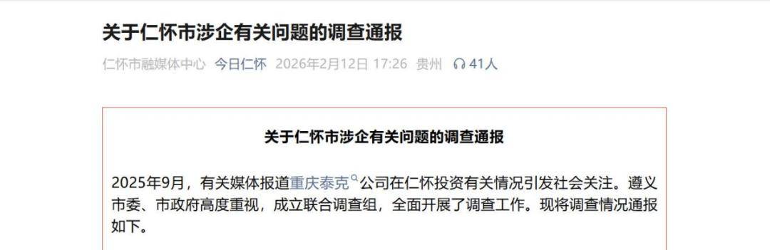 去年9月,有关媒体报道了重庆泰克公司在仁怀投资有关情况,并迅速引发社会关注(延伸阅读:)。为此,遵义市委、市政府高度重视,成立联合调查组,全面开展了调查工作。